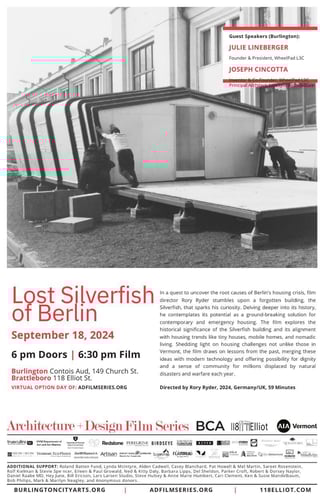 In a quest to uncover the root causes of Berlin’s housing crisis, film director Rory Ryder stumbles upon a forgotten building, the Silverfish, that sparks his curiosity. Delving deeper into its history, he contemplates its potential as a ground-breaking solution for contemporary and emergency housing. The film explores the historical significance of the Silverfish building and its alignment with housing trends like tiny houses, mobile homes, and nomadic living. Shedding light on housing challenges not unlike those in Vermont, the film draws on lessons from the past, merging these ideas with modern technology and offering possibility for dignity and a sense of community for millions displaced by natural disasters and warfare each year.